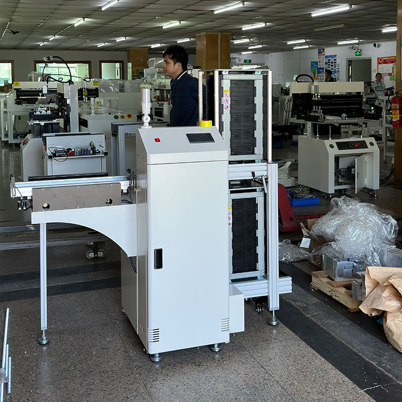 SMT上板机,也称为自动送板机或PCB装载机,是SMT生产线起始端的关键设备。它的核心功能是自动、持续地将空的PCB板从料架中取出并精准地传送到下一台设备(通常是锡膏印刷机或贴片机)的传送带上。