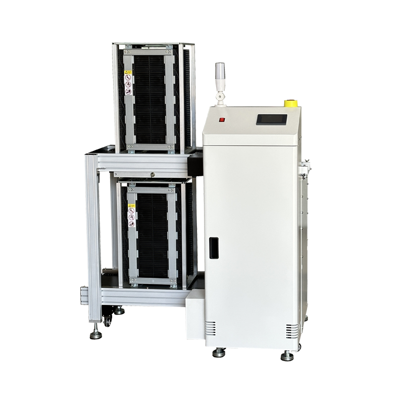 咱们这款上板机采用推板式+升降式双模式设计,工作流程:将装有PCB板的料框放入设备→设备接收到下位机(印刷机/贴片机)的求板信号→升降平台自动升降定位→推板机构平稳将PCB板推出→板子顺利进入下一道工序,全程SMEMA信号通讯,与整线设备无缝联动,实现全自动送板。